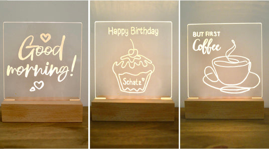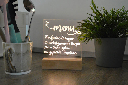 Dein Wunsch Licht lässt sich mit dem mitgelieferten Stift schnell und einfach beschreiben. Wird es Zeit für eine neue Botschaft, lässt sich die alte einfach wegwischen und es ist Platz für die nächste Beschriftung.